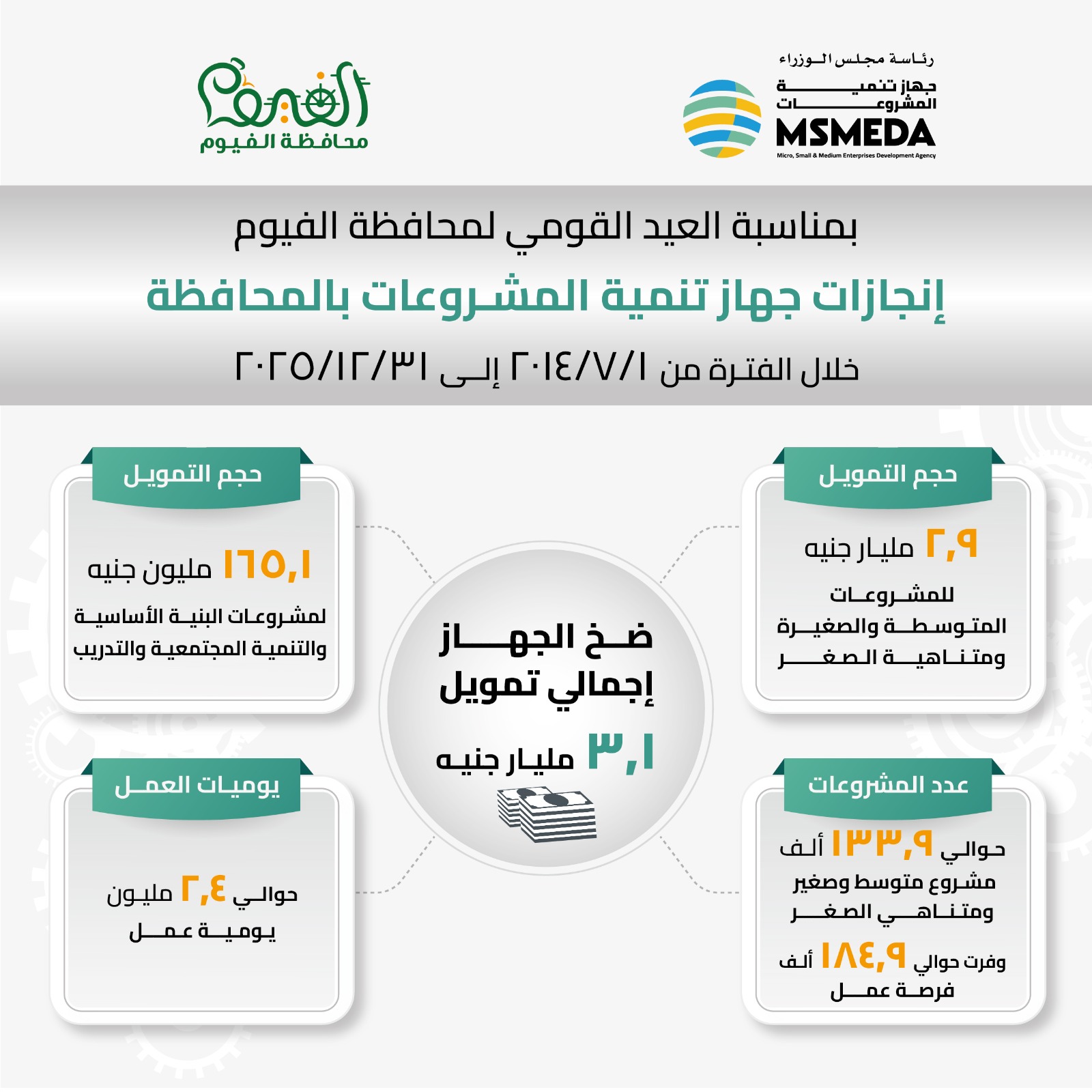 أعلن جهاز تنمية المشروعات المتوسطة والصغيرة ومتناهية الصغر عن ضخ تمويلات إجمالية بلغت 3.1 مليار جنيه بمحافظة الفيوم، وذلك خلال الفترة من 1 يوليو 2014 حتى 31 ديسمبر 2025، في إطار جهوده لدعم المشروعات الصغيرة وتعزيز فرص العمل بالمحافظة.